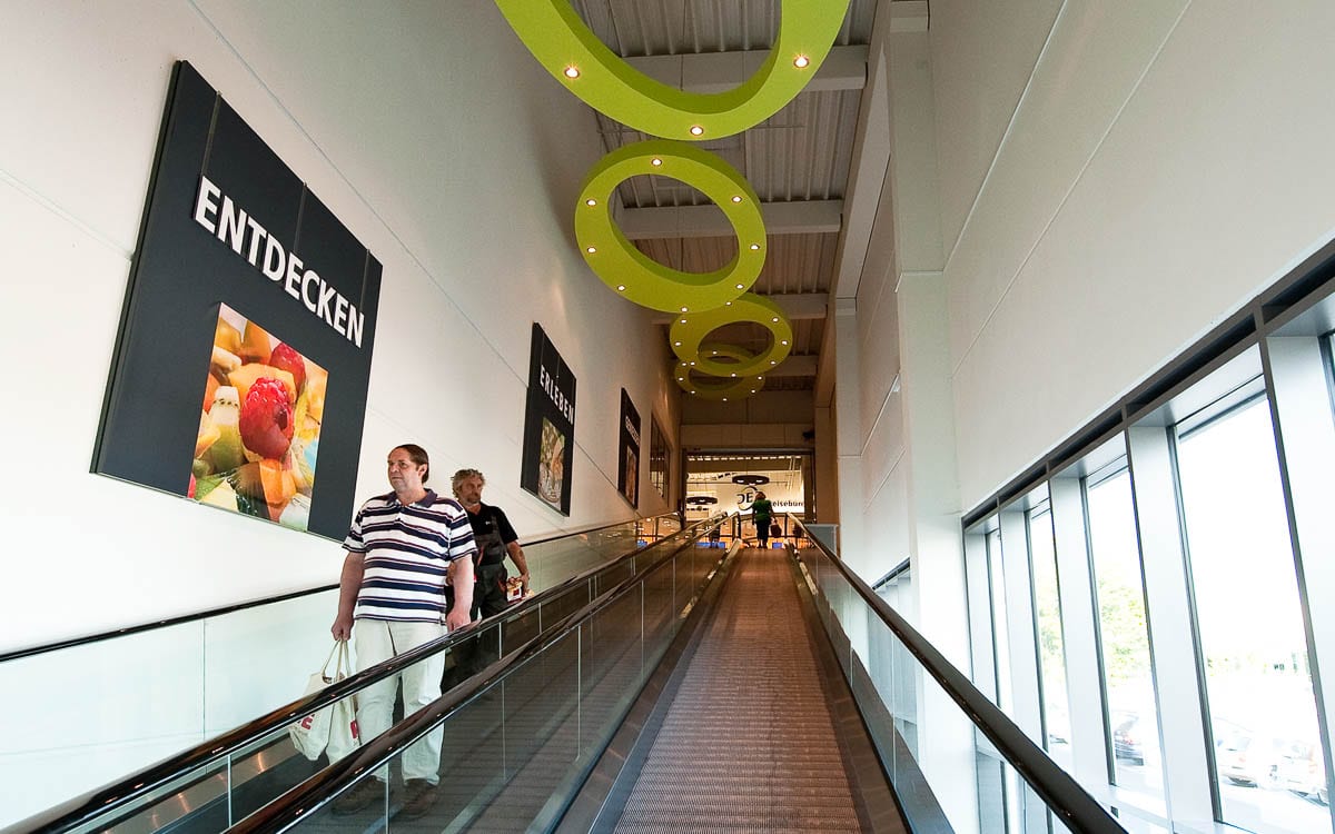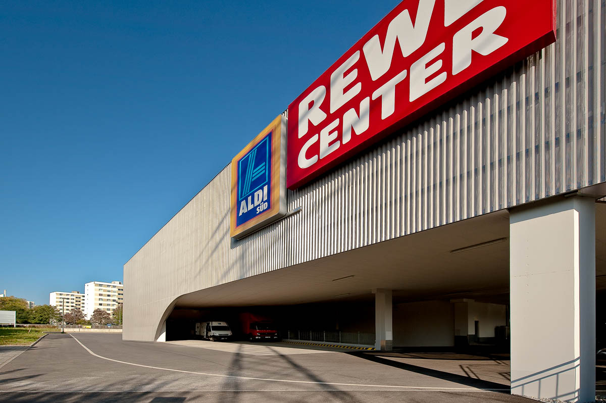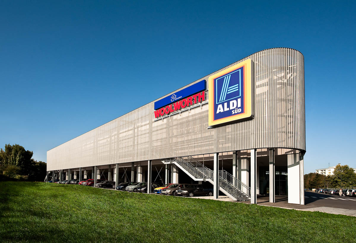 Das klassische Fachmarktzentrum bekam durch eine Streckmetallfassade eine attraktive neue Optik.