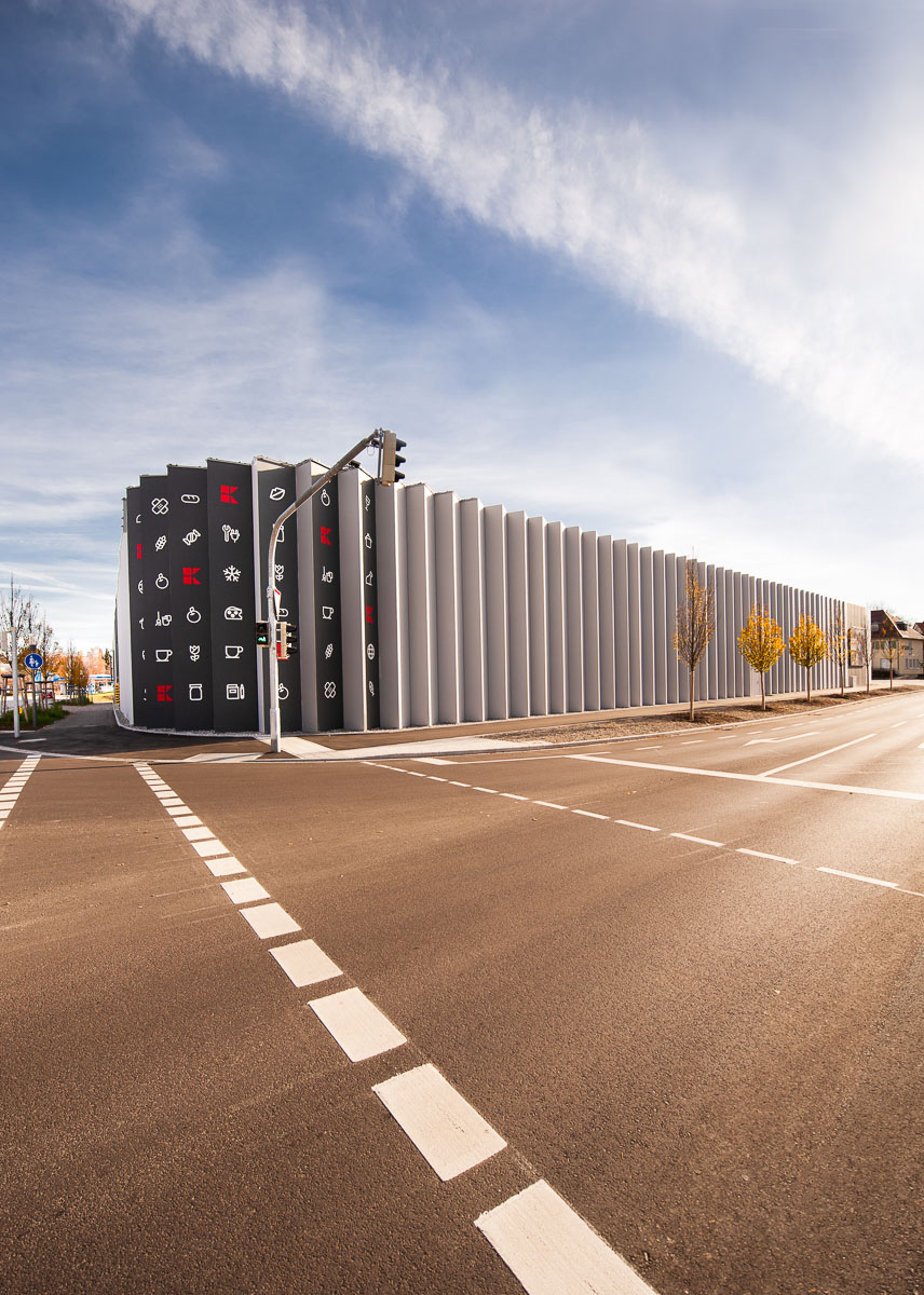 In exponierter Lage am Ortseingang von Kaufbeuren stand das in die Jahre gekommene und nicht mehr zukunftsfähige Gebäude. Es entstand der Neubau in optisch markanter Fassadenfaltung aus gefaltetem Beton und im Osten der Eingang in großzügiger Glasfassade.