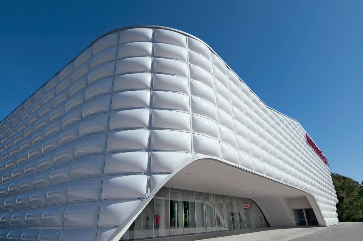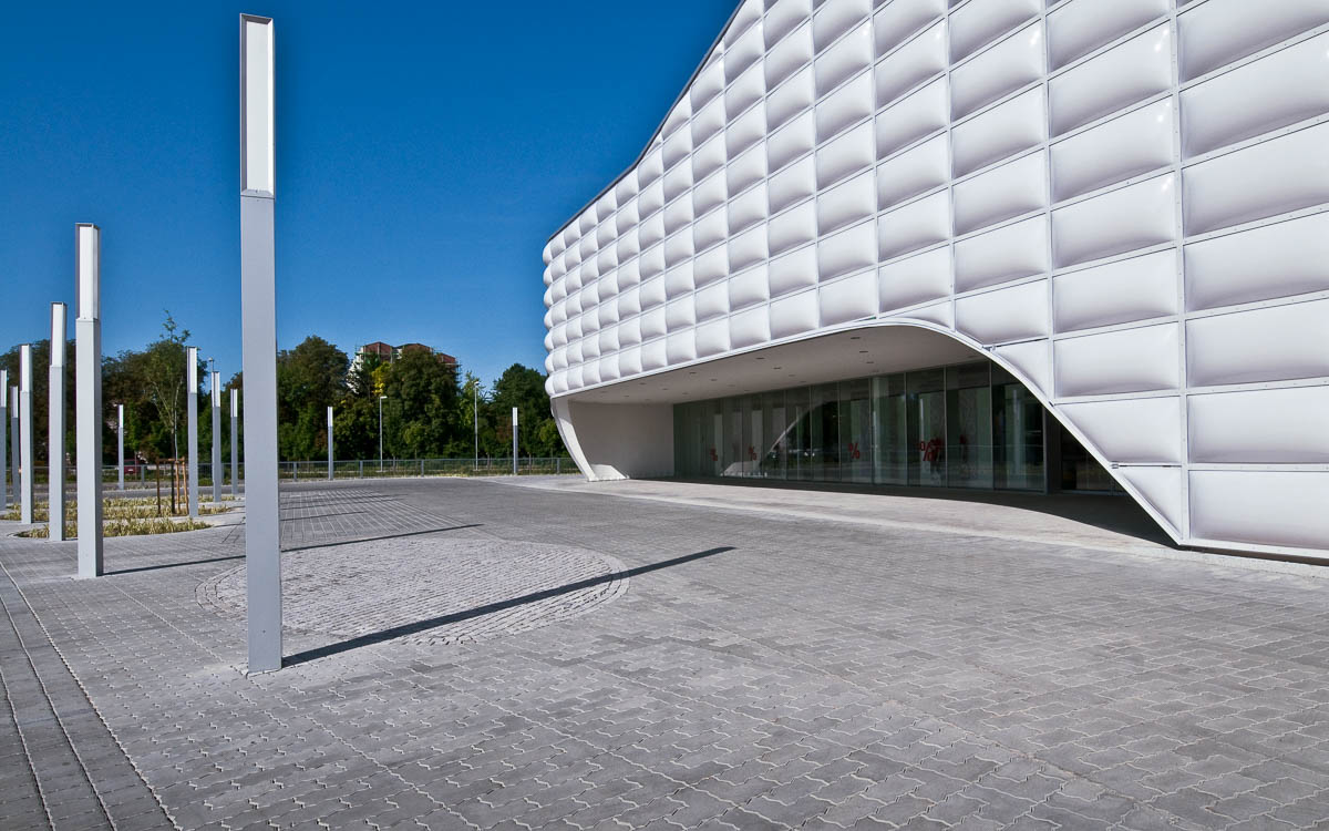 Das standardisierte Modehaus zeigt sich dank seines Plissees an der Fassade optisch anspruchsvoll. Besonders reizvoll und spannend wirkt die hinterleuchtete Fassade bei Nacht.